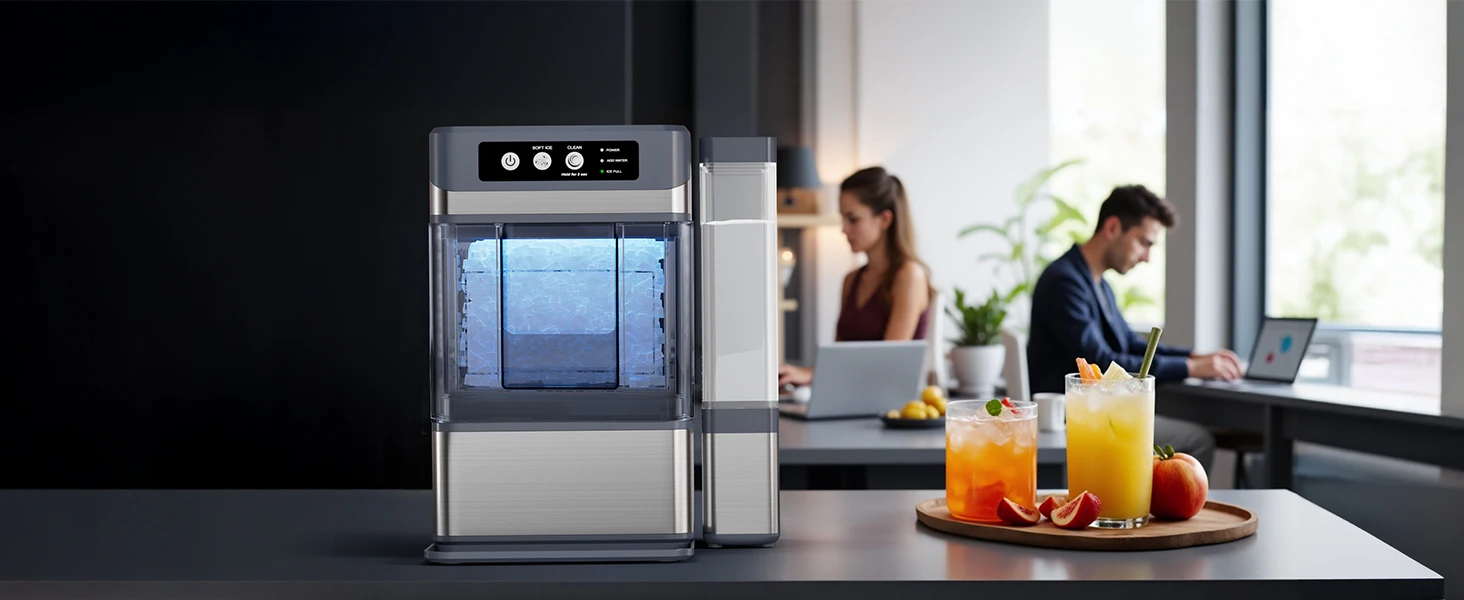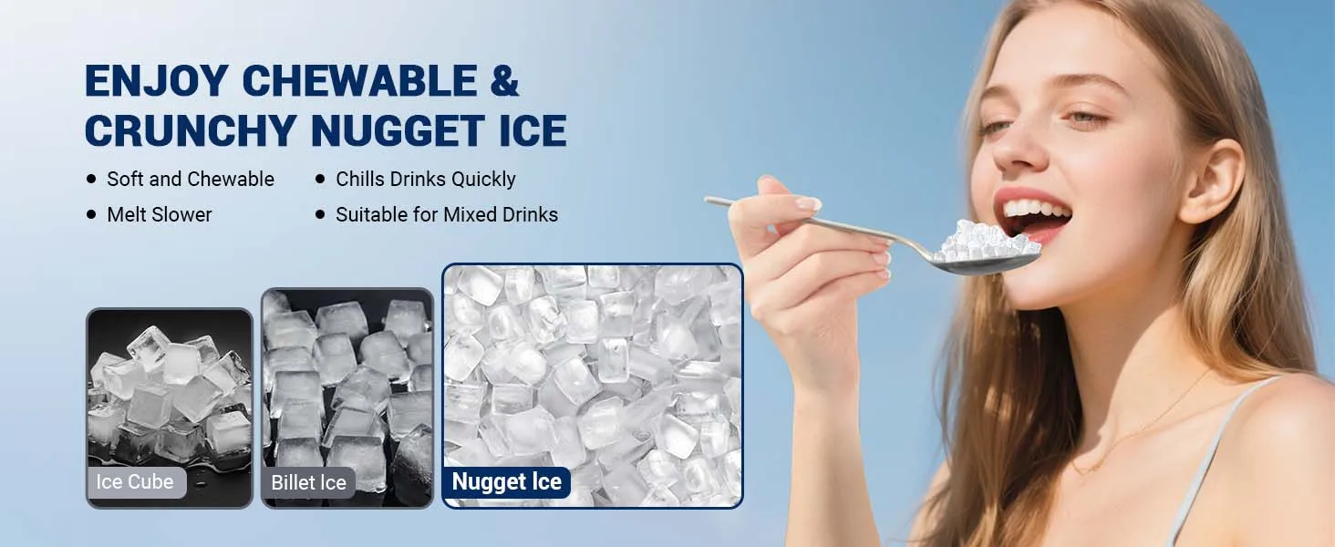 Chewable Nugget Ice – Soft, crunchy, and satisfying pellet ice with authentic flavor, perfect for drinks, smoothies, and cocktails.